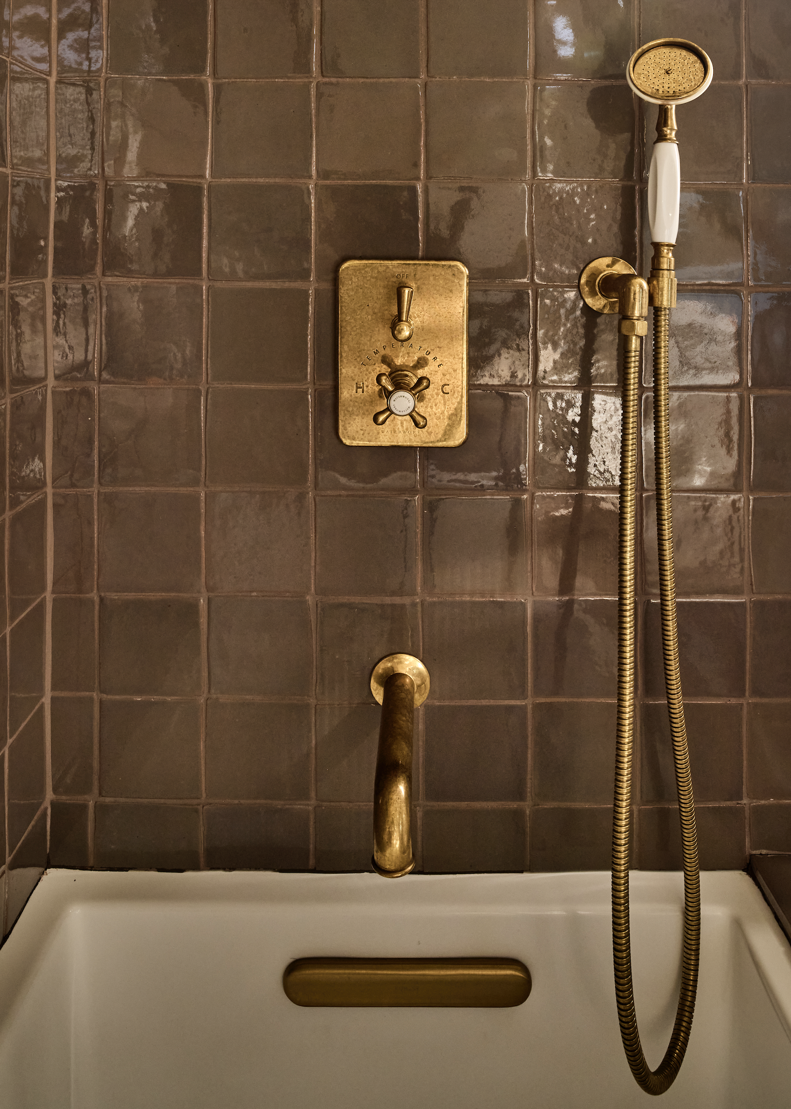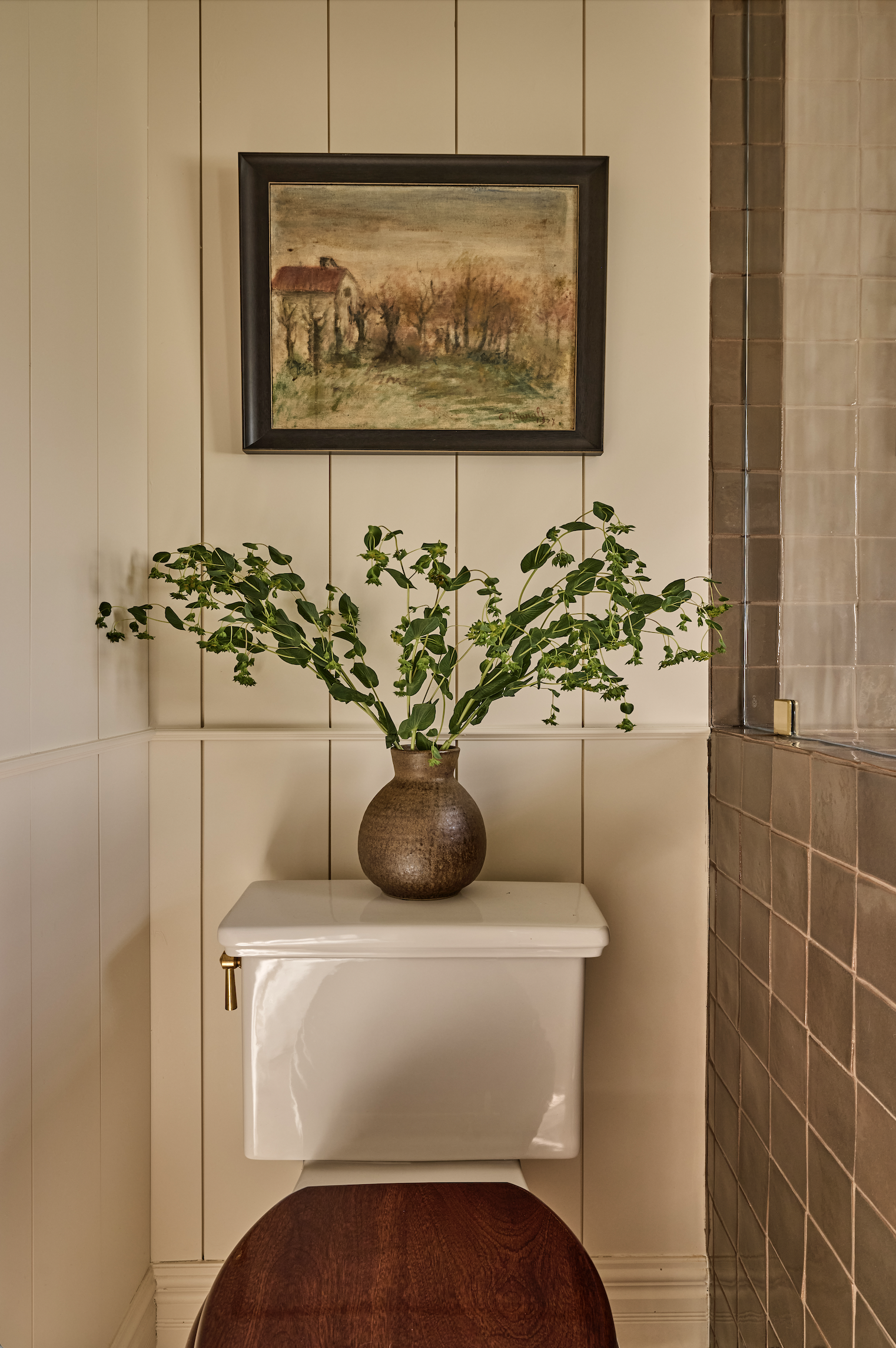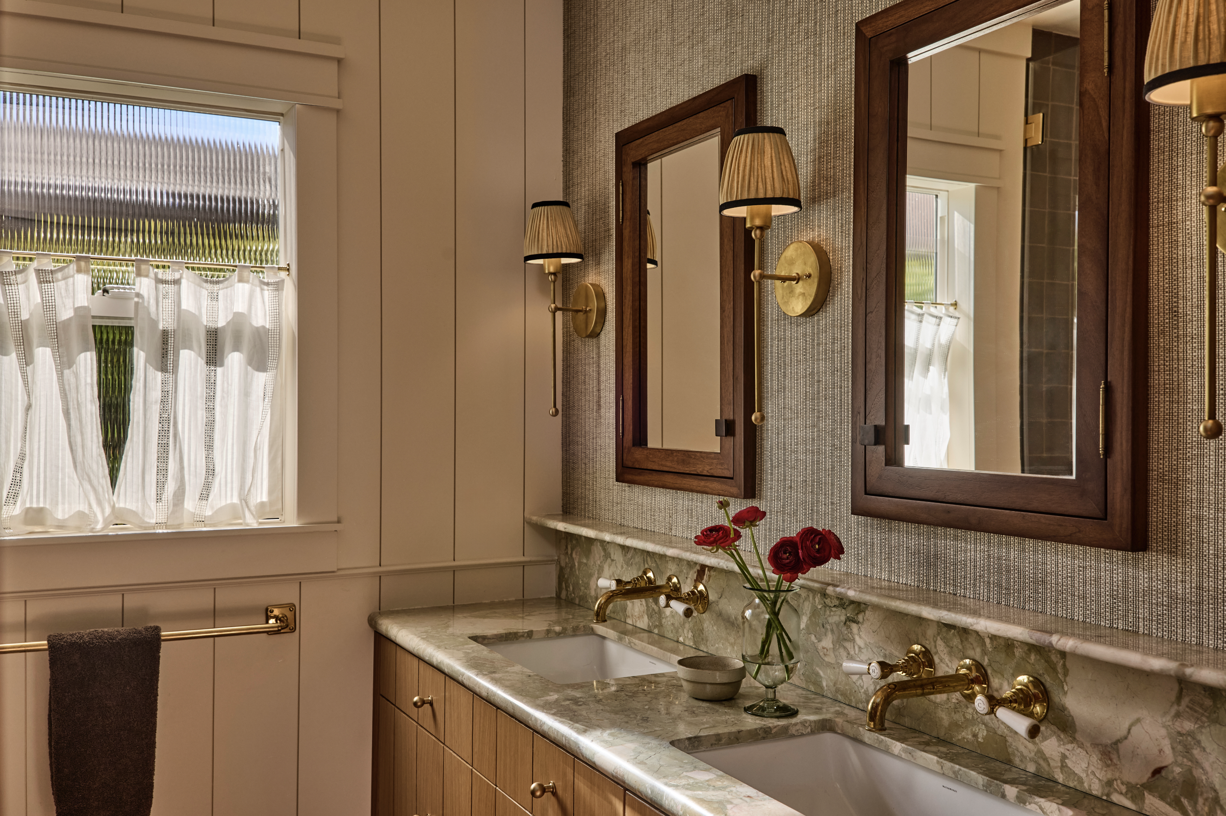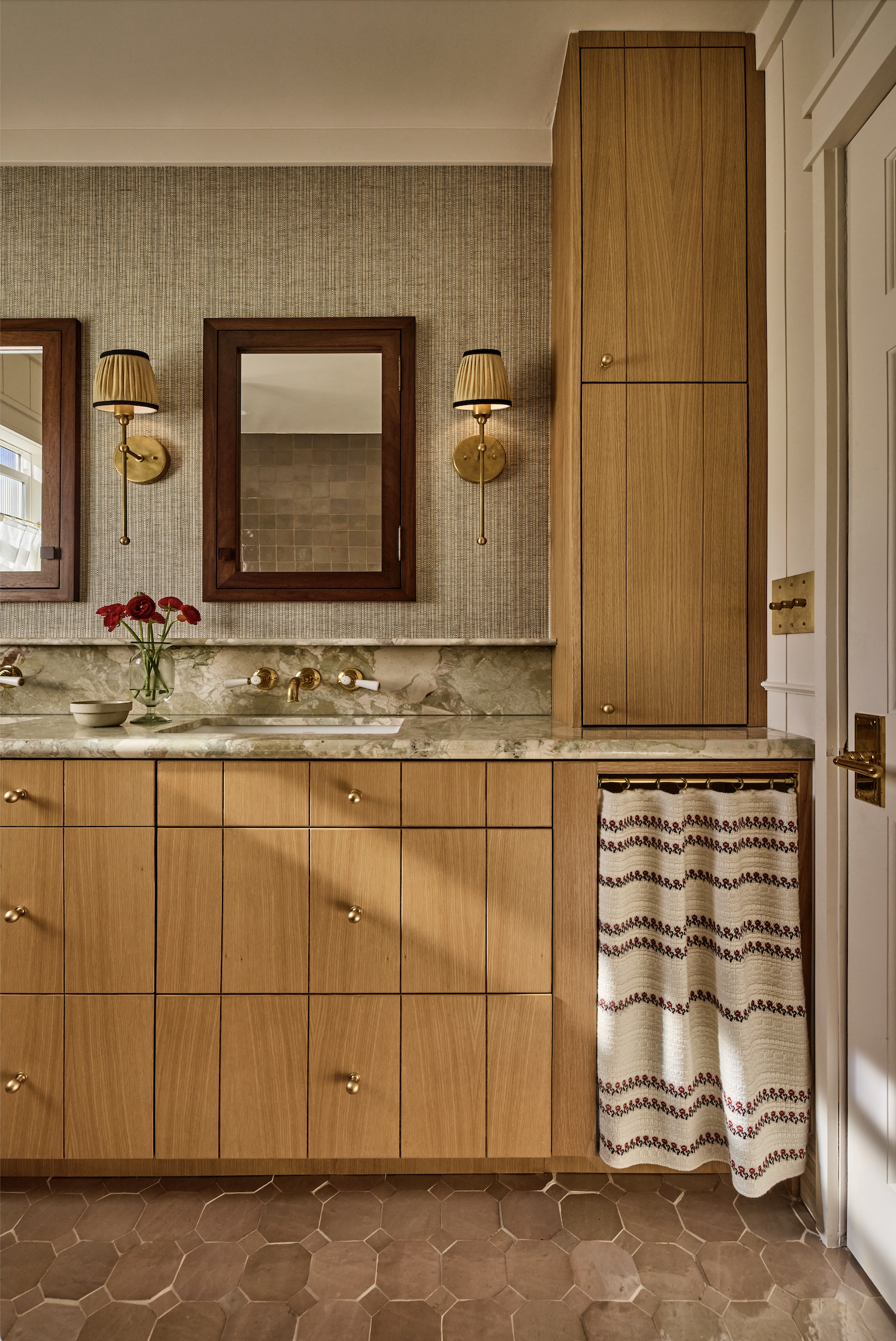 The bathroom is defined by warm oak cabinetry and honed stone surfaces, where traditional detailing creates this lived in warmth. Grasscloth wall covering and custom dark wood–framed medicine cabinets introduce texture and contrast, while sculptural brass sconces cast a soft, ambient glow. Handmade terracotta tile grounds the space with an earthy sensibility, balanced by a vintage-inspired textile detail that softens the composition. The result is a thoughtful blend of craftsmanship and comfort, rooted in timeless materials and modern restraint.